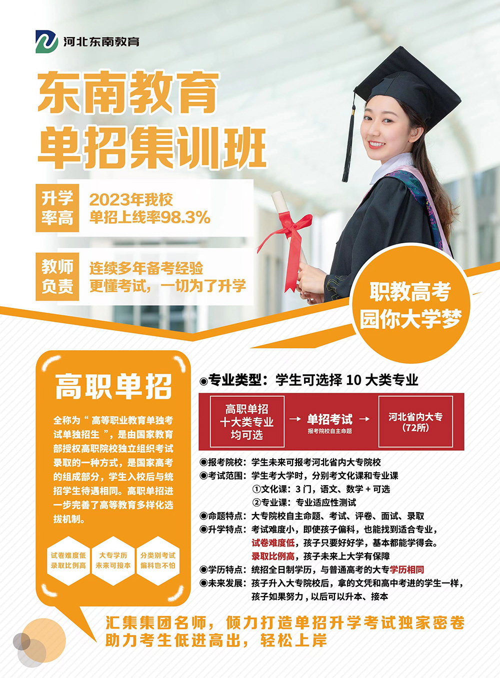 培训内容: 单招文化课、单招职业技能培训、往年考试真题)、职业生涯规划、单招志愿指导填报。