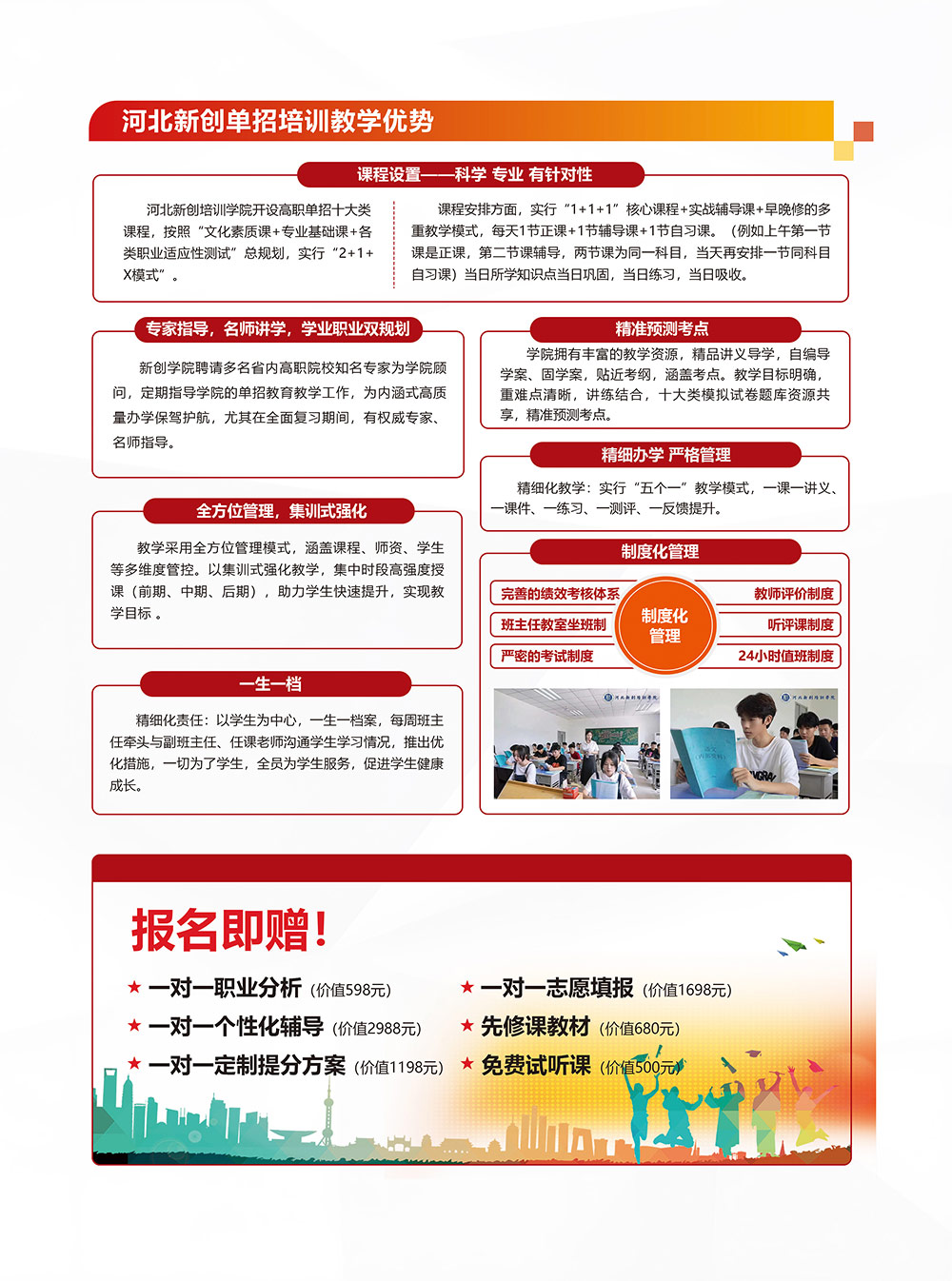 河北新创培训学院地处河北省省会石家庄市,成立于2019年,是一所经河北省教育厅批准成立的多层次、综合类高等教育院校,学院专注为应往届中职、普高学生提供系统化单招备考服务。学院拥有一支专业、高效、精益求精、专研河北单招升学的讲师团队,从高职单招课程研发、升学政策分析、志愿填报指导等方面,为每一位学员提供最优质的升学服务。