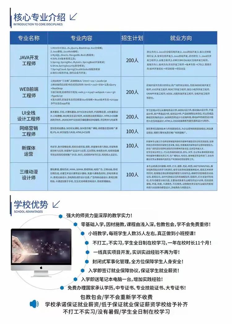 JAVA开发专业、Web前端开发专业、新媒体运营专业、UI全栈开发设计专业、网络运维工程师专业、三维动漫设计师专业。